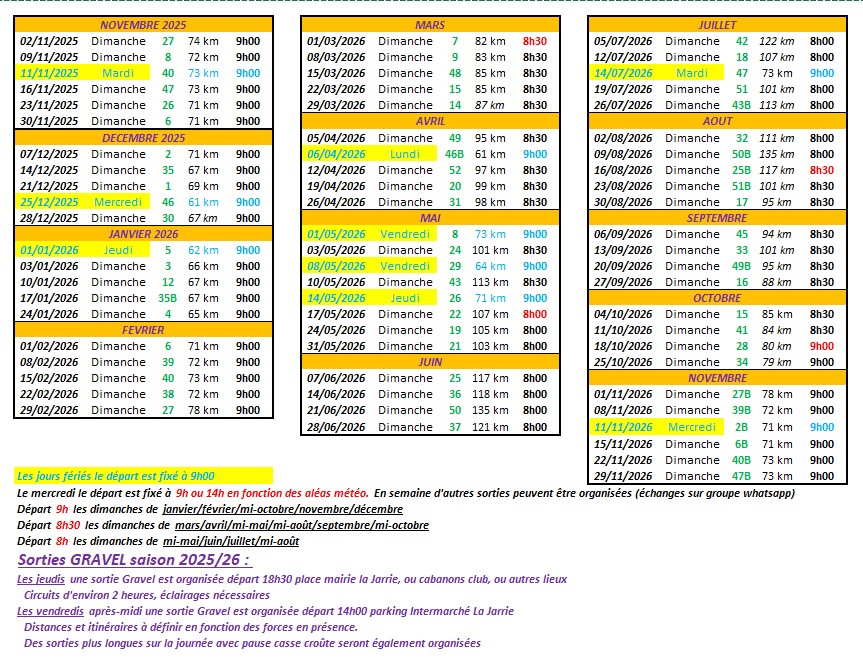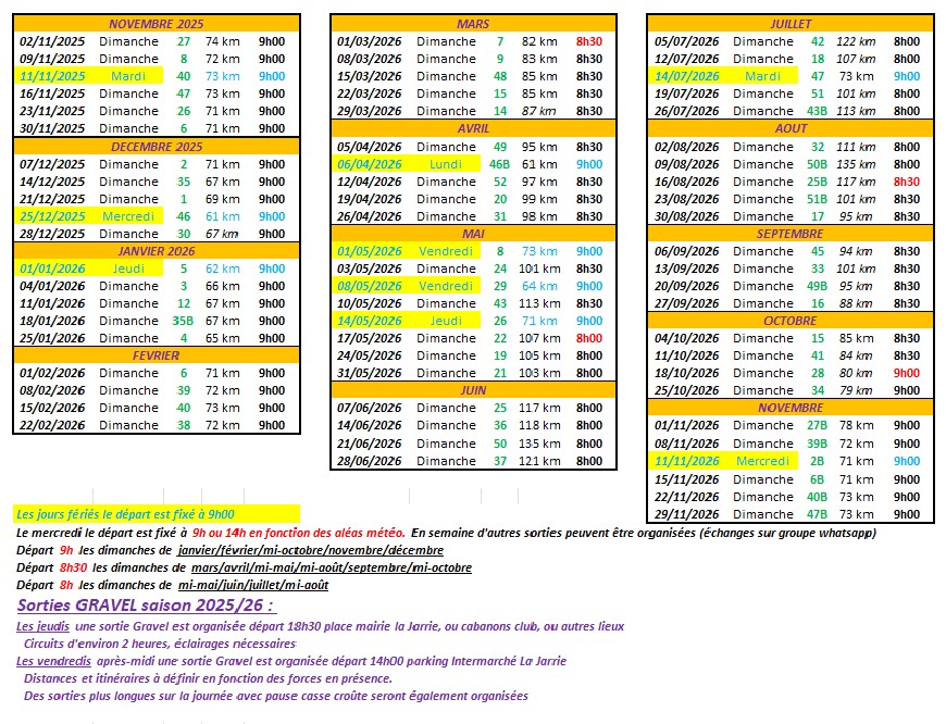 Horaires sorties saison 2025-2026 et numéros de parcours (cliquer sur les images)Le départ des sorties du dimanches et mercredi se fait parking Intermarché La Jarrie (coté panneau d'information) .